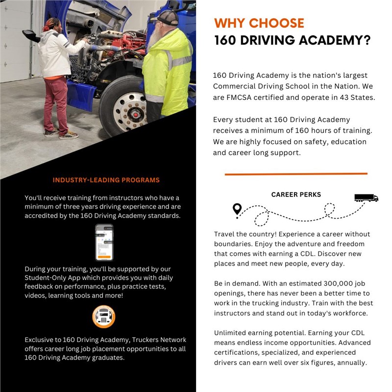 160 Driving Academy's sister companies, Truckers Network, and the 160 Driver Score provide the most advanced job placement and compliance scoring capabilities in the industry.