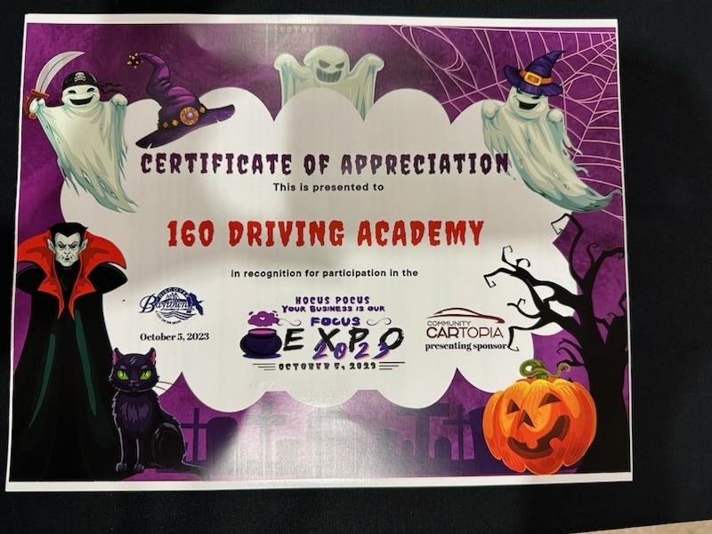 160 Driving Academy Baytown Branch Location participated in a Hocus Pocus Themed Business Expo Event on Thursday, October 5th, 2023.